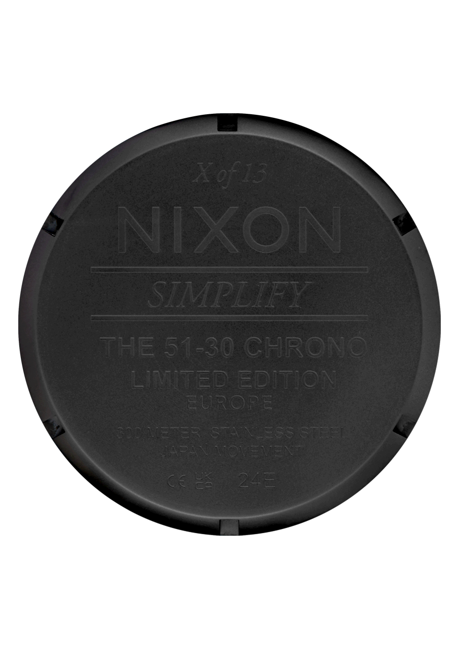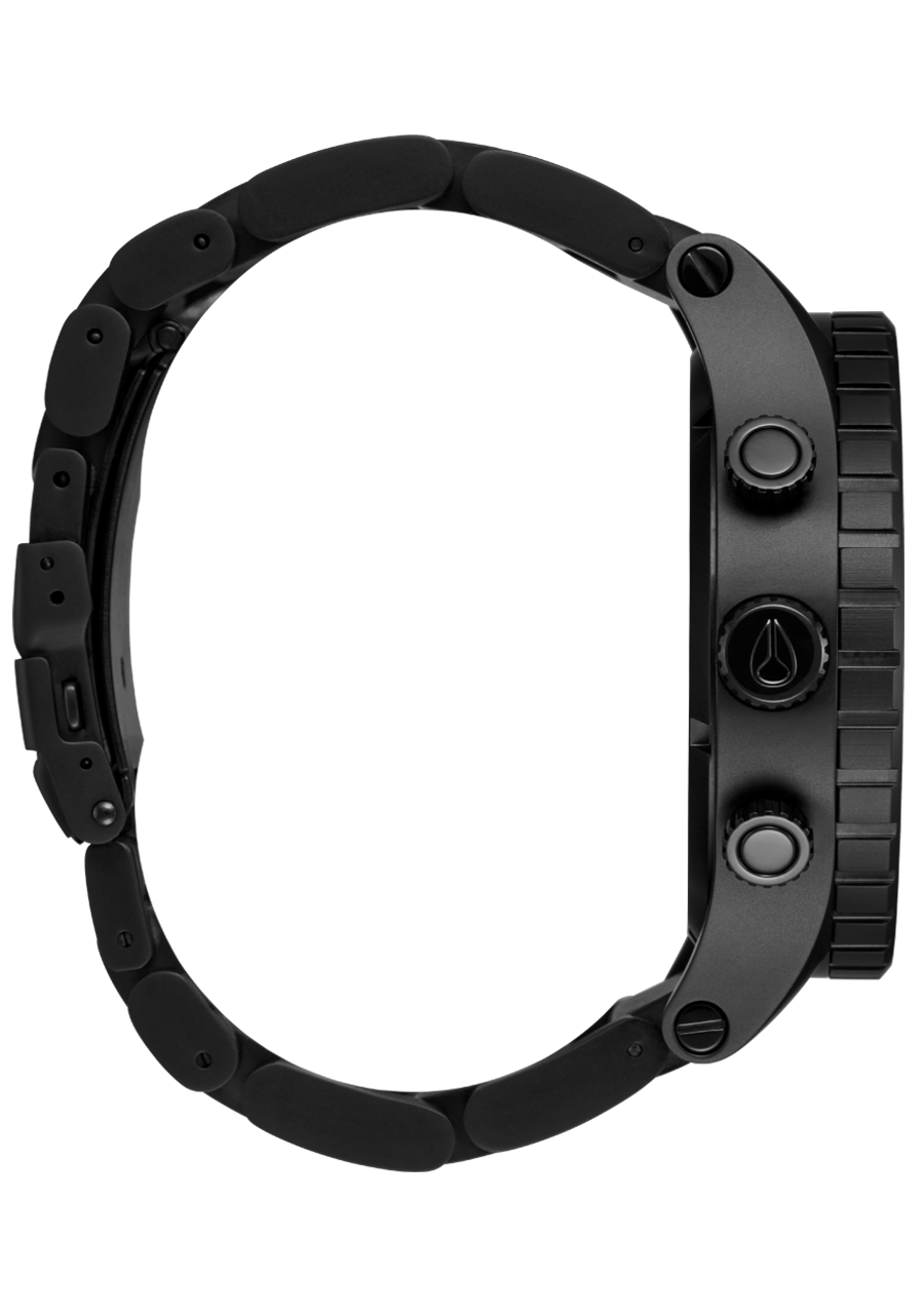 Cinq 13 marquent chaque heure autour du cadran, avec un seul 13 luminescent. Lequel ? Eh bien, cela dépend de la région du monde d'où vous l'obtenez. Les poussoirs et la couronne vissée sont situés du côté 9 heures du boîtier au lieu de 3 heures pour éviter les "morsures de poignet" pendant une utilisation active. Lunette rotative unidirectionnelle pour un minuteur de compte à rebours analogique. Chronographe à six aiguilles avec minuteur de 24 heures et sous-cadrans de seconde, le tout en noir sur noir.