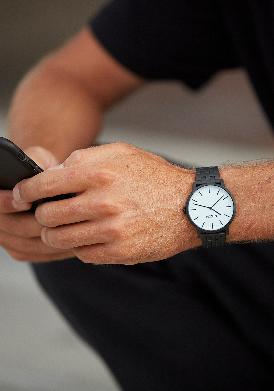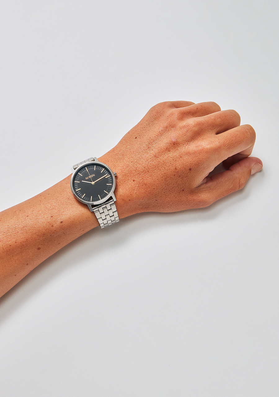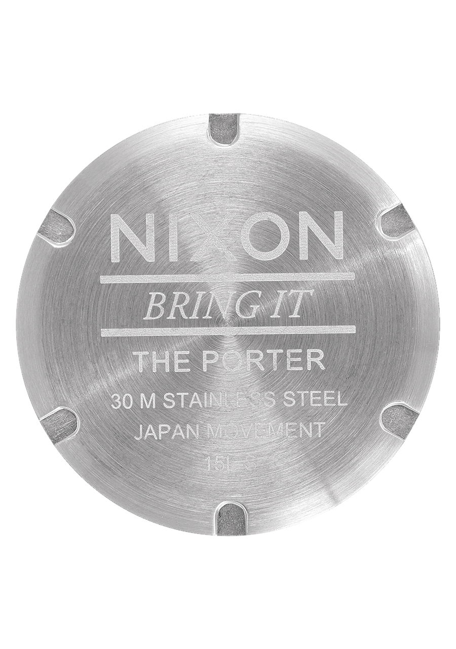 La Nixon Porter possède un boîtier et un bracelet en acier inoxydable sur mesure. La montre est conçue pour une durabilité quotidienne, avec un cristal minéral trempé, une couronne à double joint d'étanchéité, et un fond de boîtier en acier inoxydable à vis pour une protection renforcée.