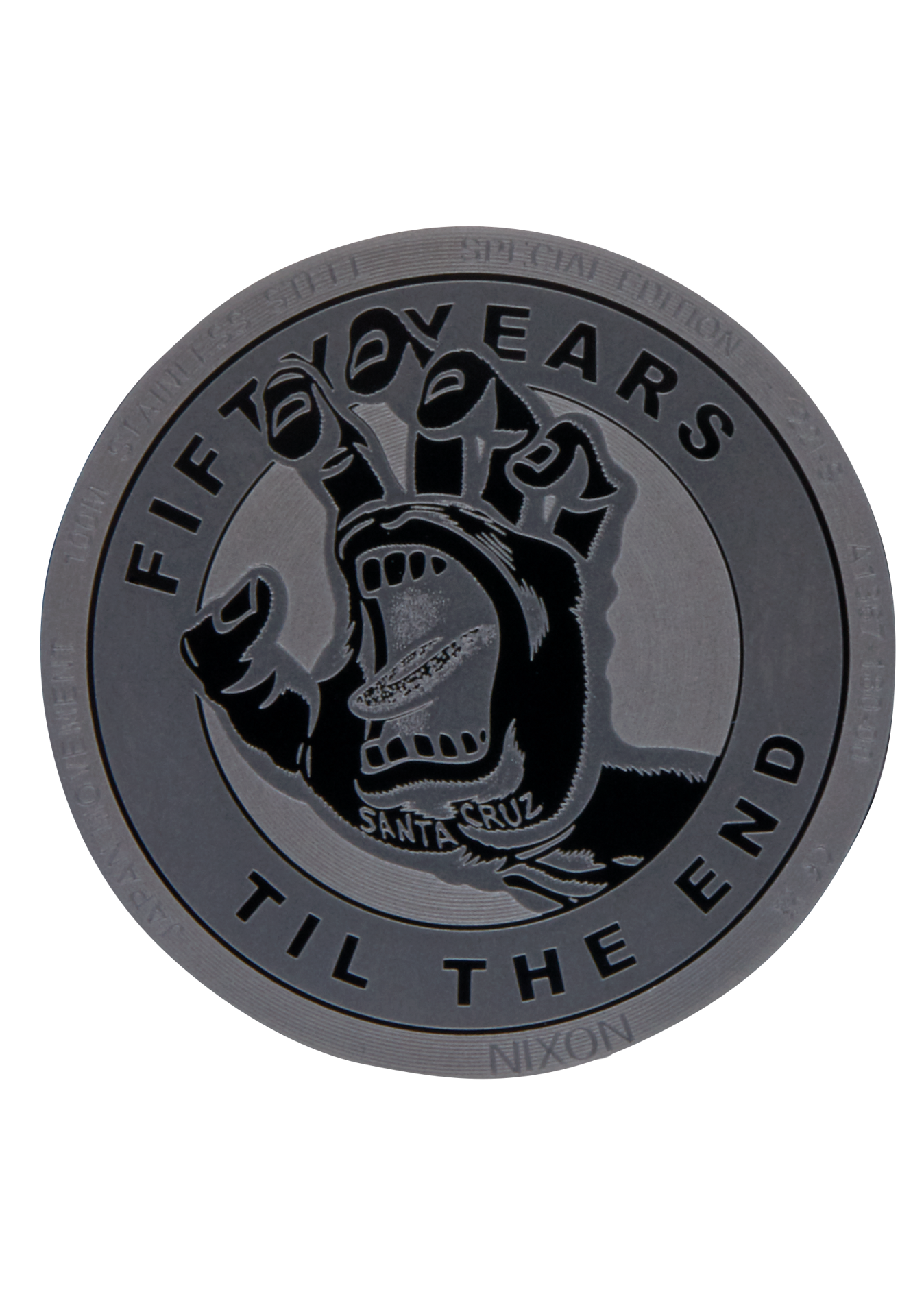 Le cadran présente des aiguilles moulées sur mesure avec une aiguille des secondes Screaming Hand, des index bâtons et un logo Santa Cruz en relief 3D.
