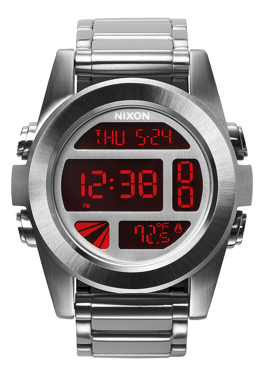 Mouvement numérique personnalisé avec affichage négatif, heure au format 12 ou 24 heures, calendrier, indicateur de température, double fuseau horaire, minuterie de compte à rebours, chronographe, alarme et fonctions d'éclairage.