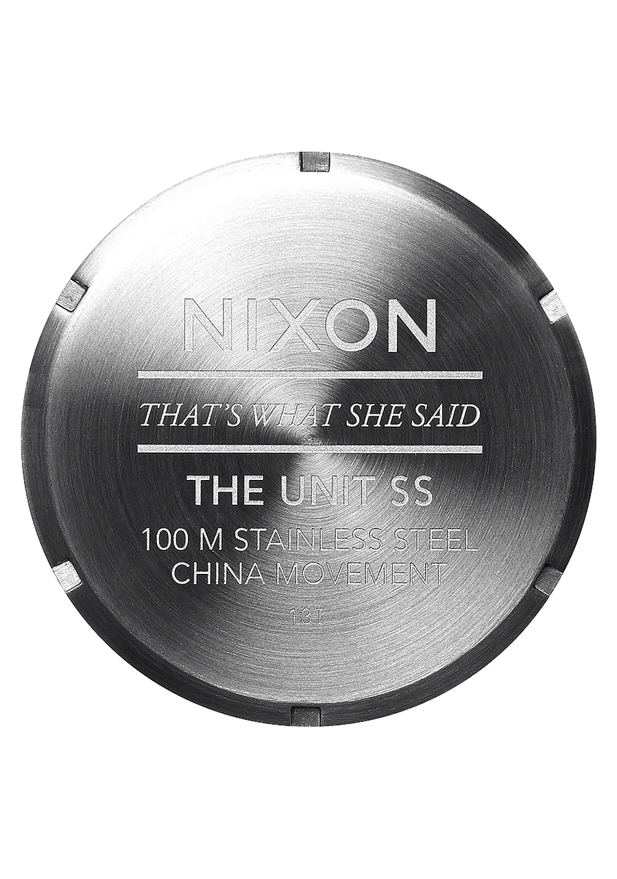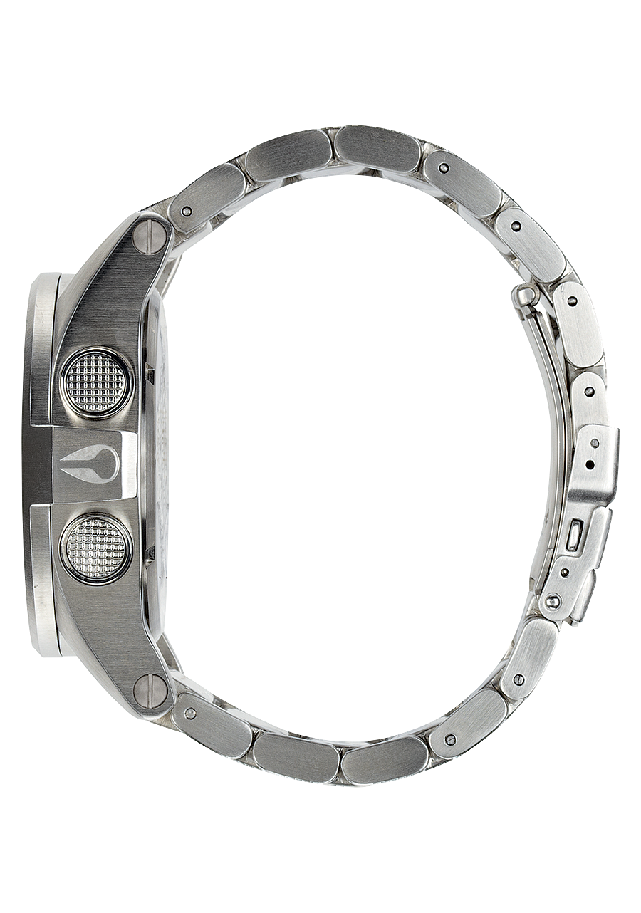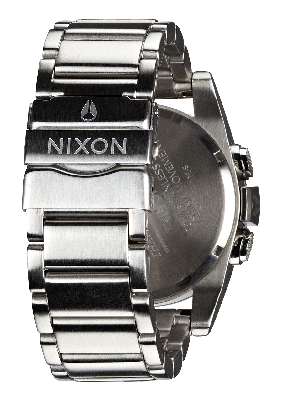 44,5 mm, boîtier personnalisé en acier inoxydable massif, étanche 100 mètres/10 ATM, lunette fixe en acier inoxydable massif, verre minéral durci, poussoirs en acier inoxydable avec double joint, fond de boîtier vissé en acier inoxydable et anses à goupilles vissées.