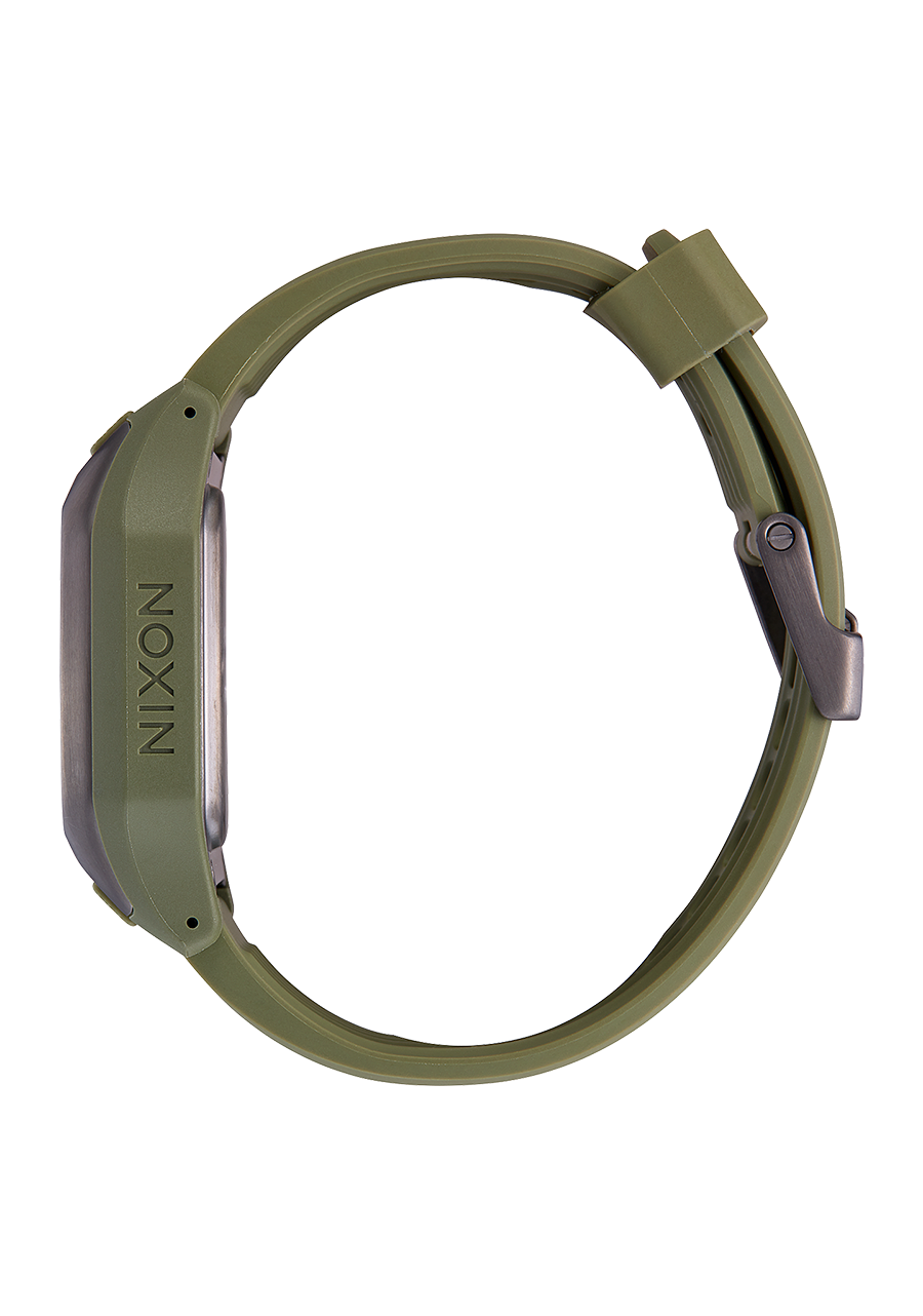 44mm custom injection molded reinforced recycled ocean plastics case and an integrated stainless steel bezel with a 100 meter / 10 ATM water rating. Includes co-molded silicone pushers located at 12 and 6 o'clock, with solid stainless steel screw down caseback.
