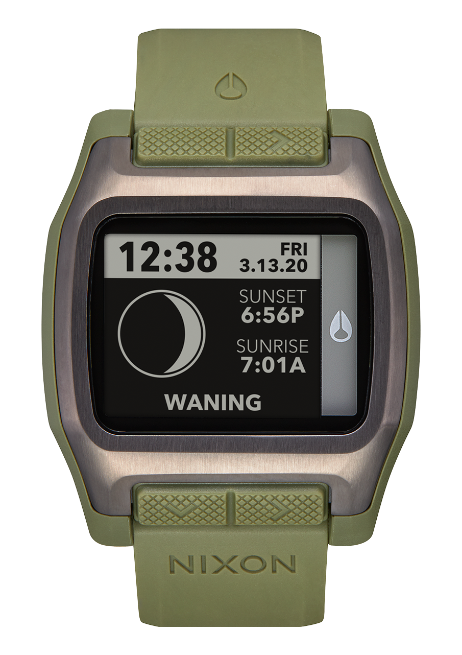Custom digital module with high-resolution MLCD with front light, 550 pre-programmed beach locations with precise tide, sun, and moon data, chronograph with action time stamp and countdown timer.